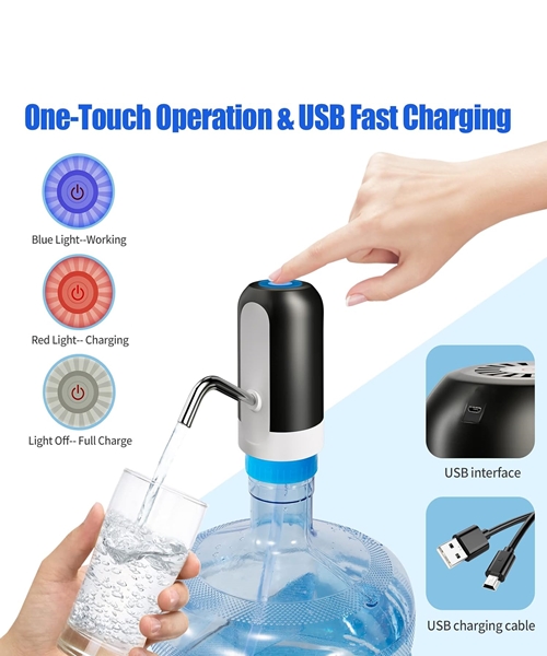 Električna pumpa za vodu iz balona je jedinstvena pumpica koja će vam olakšati sipanje vode iz velikih balona za vodu od 5 ili više litara. Potrebno je samo da je napunite na USB punjaču, namestite na otvor flaše i uključite. Pritiskom na dugme voda će sama poteći, bez da morate da podižete ili pomerate tešku flašu punu tečnosti.