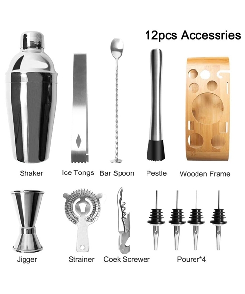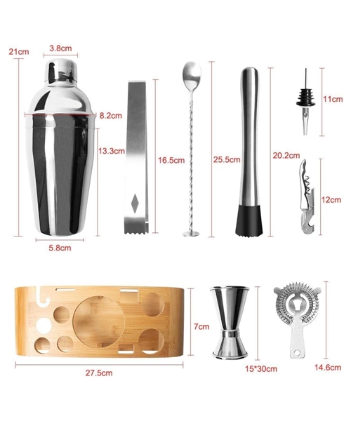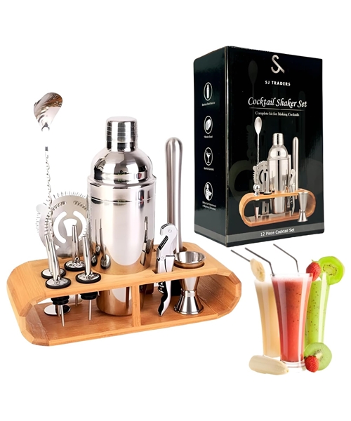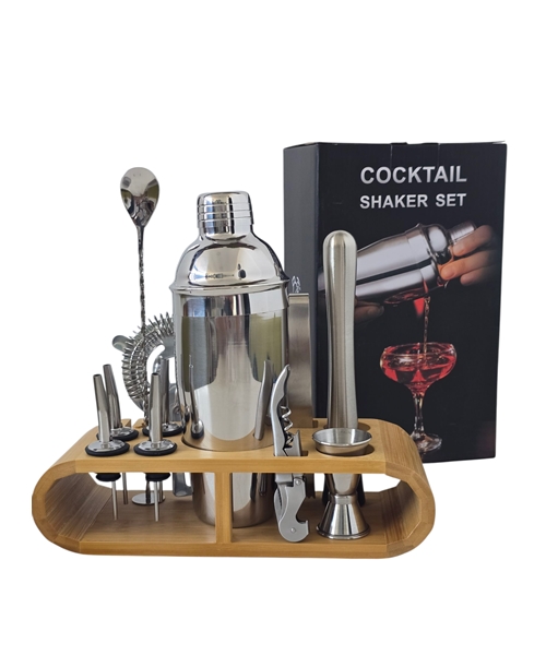 Vrhunski šejker set za pravljenje koktela za kućnu ili profesionalnu upotrebu, idealan i kao poklon. Sastoji se od 12 raznovrsnih delova i alata za spremanje koktela. Izrađeno od nerđajućeg čelika – inoxa.